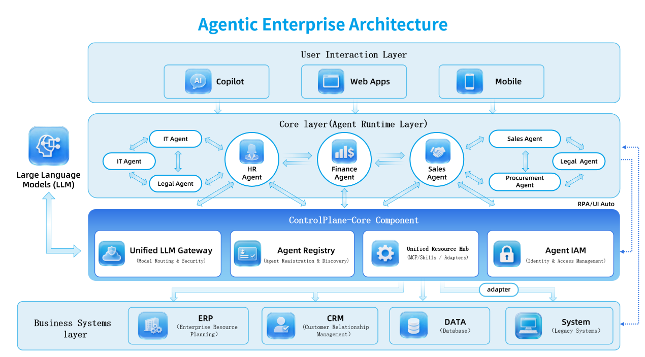 This is the most radical architectural change. Notice the HR Agent, Finance Agent, and Sales Agent in the diagram—they’re no longer isolated systems but collaborative nodes in an intelligent agent network.